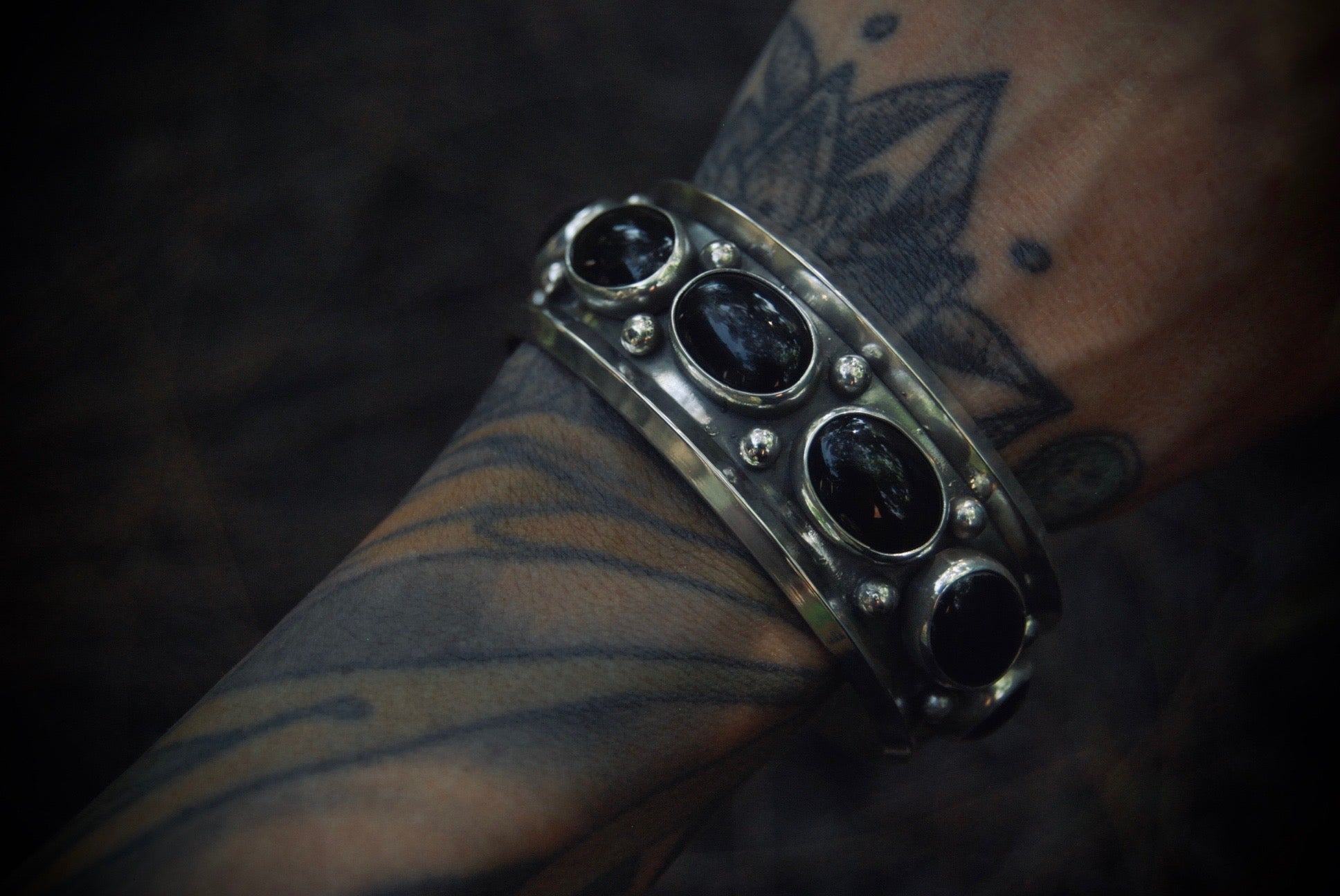7 Onyx with triangle wire border and two moons on each end. This cuff is a beast!